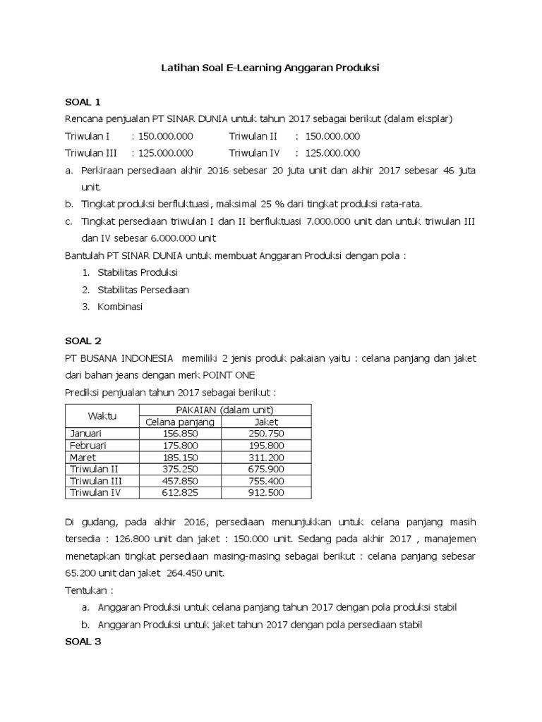 Soal Anggaran Produksi Dan Jawabannya from imgv2-2-f.scribdassets.com Artinya tingkat persediaan yang tidak terlalu besar dan tidak terlalu kecil. Menurut pendapat saudara bagaimana cara untuk mengatasi 4 kelemahan anggaran tersebut? Apa yang di maksud dengan anggaran produksi? Dalam menyusun anggaran produksi dengan pendekatan stabilitas produksi, seperti contoh di atas, maka produksi setiap triwulan sebesar 1.980 unit dibagi 4 sama dengan 495 unit; Perusahaan memberikan informasi, persediaan awal berang dagang adalah 15.000 unit dan perusaah menginginka persediaan akhir sebesar. Jenis order yang short time dan variasi produk maka schedule produksi dibuat setiap minggu diberi. Jelaskan perhitungan anggaran produksi dalam mempengaruhi kegunaan anggaran dan penjualan ? Data apa yang di gunakan dalam membuat anggaran produksi?